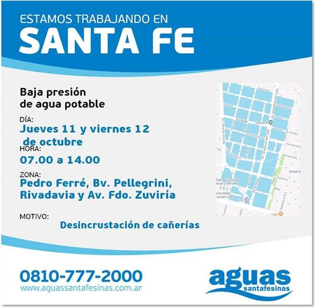 Los días 11 y 12 de octubre, de 7 a 14 horas, ASSA disminuye la presión del suministro, en la zona comprendida por Pedro Ferré, Boulevard Pellegrini, Rivadavia y Facundo Zuviría. Durante la suspensión del servicio, la empresa proveedora de agua potable trabaja en limpieza de la red de distribución, en el sector.