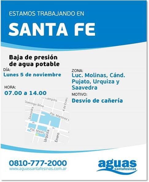 El 5 de noviembre, de 7 a 14 horas, ASSA disminuirá la presión del suministro, en la zona comprendida por Luciano Molinas, Cándido Pujato, Urquiza y Saavedra. Durante la suspensión del servicio, la empresa proveedora de agua potable desviará cañería de la red de distribución, en Mariano Comas y Francia.