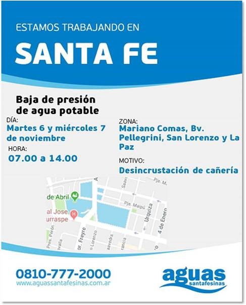 Los días 6 y 7 de noviembre, de 7 a 14 horas, ASSA disminuye la presión del suministro, en la zona comprendida por Mariano Comas, Boulevard Pellegrini, San Lorenzo y La Paz. Durante la suspensión del servicio, la empresa proveedora de agua potable limpia cañerías en López y Planes al 3600 y al 3700.