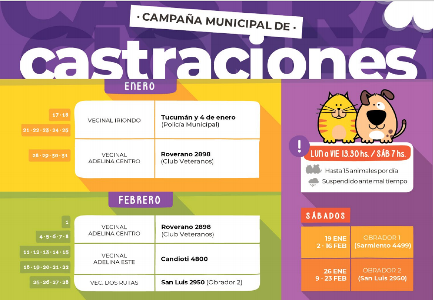 Entre lunes 28 de enero y viernes 8 de febrero, la unidad veterinaria móvil esteriliza quirúrgicamente a perros y gatos en Roverano 2898, Club de Veteranos. La atención tiene lugar desde las 13:30. El sábado 2 de febrero, ocurre lo propio en el obrador municipal de Sarmiento 4499, a partir de la hora 7. Y el sábado 9 de febrero, otro tanto sucede en San Luis 2950, también por la mañana.