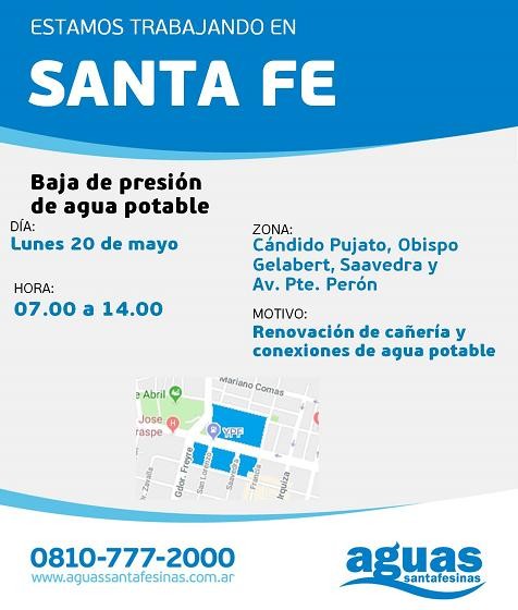 De 7 a 14 horas, ASSA disminuye el suministro, en la zona comprendida por Cándido Pujato, Obispo Gelabert, Saavedra y Avenida Presidente Perón. Precisamente, la baja presión de agua se debe a la renovación de la red de distribución y cañerías domiciliarias, en la zona.