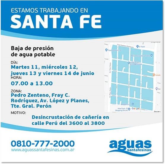 Desde este martes y hasta el viernes, Aguas Santafesinas realiza tareas de limpieza mecánica de la red de distribución para mejorar el servicio sobre calle Perú del 3600 al 3800. Entre las 7 y las 13, los trabajos de ASSA provocan la disminución de la presión de agua en la zona delimitada por Pedro Centeno, Fray Cayetano Rodríguez, López y Planes y Perón.