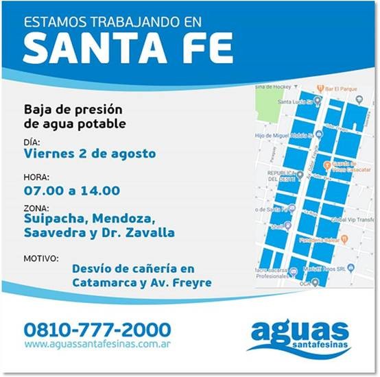 Este viernes de 7 a 14 horas, personal de Aguas Santafesinas realiza el desvío de una cañería de la red de distribución en Catamarca y Avenida Freyre, en el marco de las obras de desagües pluvial en la zona. Por tal motivo, los vecinos pueden registrar una disminución de la presión del servicio en el sector delimitado por Suipacha, Mendoza, Saavedra y Zavalla.