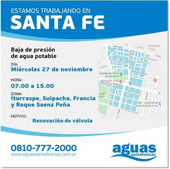 De 7 a 15, Aguas Santafesinas disminuye el suministro en los barrios Parque Garay, Constituyentes, Mariano Comas y Unión, Progreso y Libertad de Barranquitas. Durante la baja de presión del servicio, ASSA realiza la renovación de una válvula de la red primaria de distribución en Avenida Freyre y Boulevard Pellegrini, por la obra de desagües pluviales desarrolladas en el lugar.