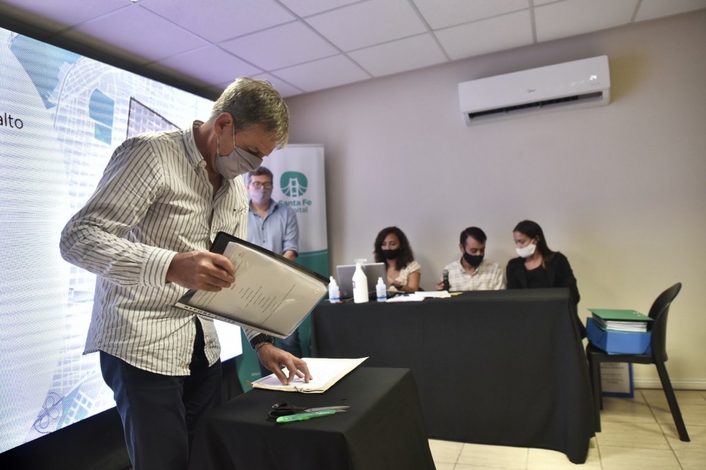 El intendente Emilio Jatón presentó el plan de bacheo 2021, en el salón de la Asociación de Comerciantes, Industriales, Profesionales de la avenida Aristóbulo del Valle.