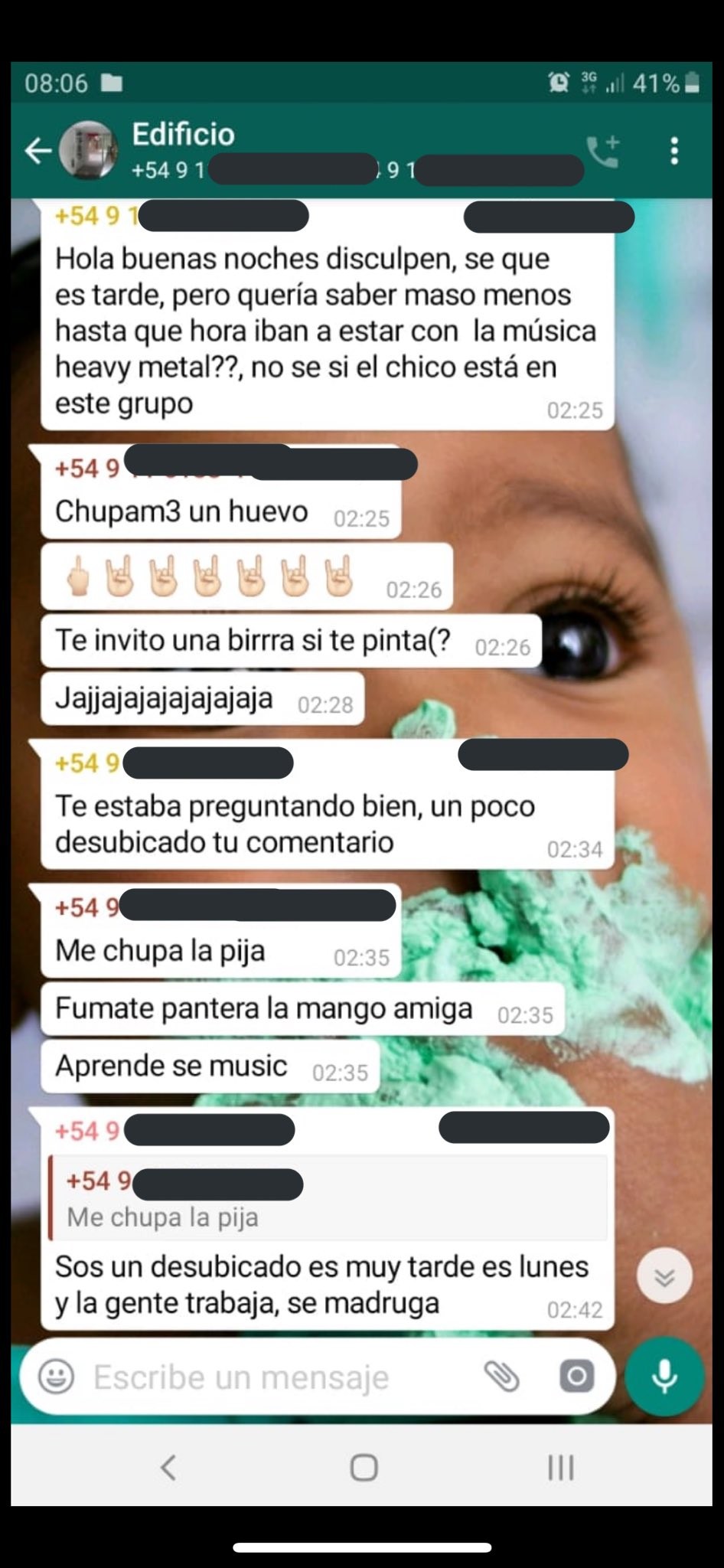 "Hola, buenas noches. Disculpen, sé que es tarde, pero quería saber mas o menos ¿hasta qué hora iban a estar con la música heavy metal? No se si el chico está en este grupo", consultó una vecina en el chat de WhatsApp y cuyo nombre no trascendió.