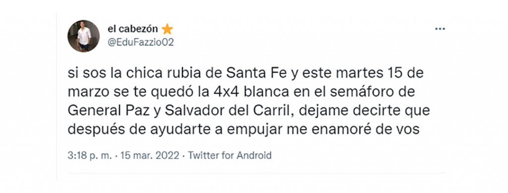 “Si sos la chica rubia de Santa Fe y este martes 15 de marzo se te quedó la 4x4 blanca en el semáforo de General Paz y Salvador del Carril, dejame decirte que después de ayudarte a empujar me enamoré de vos”, tuiteó Eduardo Fazzio desde su cuenta @EduFazzio02 sin advertir la cadena solidaria que desataría su petición.