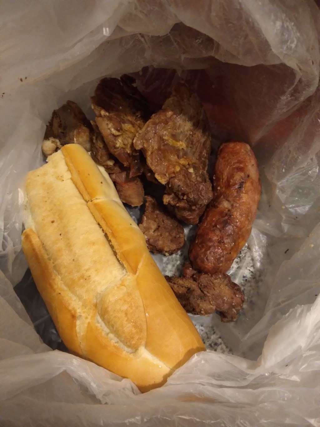 Orgullosa y anonadada por el acto, además del texto, subió una foto del obsequio. En ella se puede ver un chorizo, media tirita de asado de hueso, algunos pedazos de carne de cerdo y de vaca. Lo que más se destaca de la imagen es el pan a medio comer.