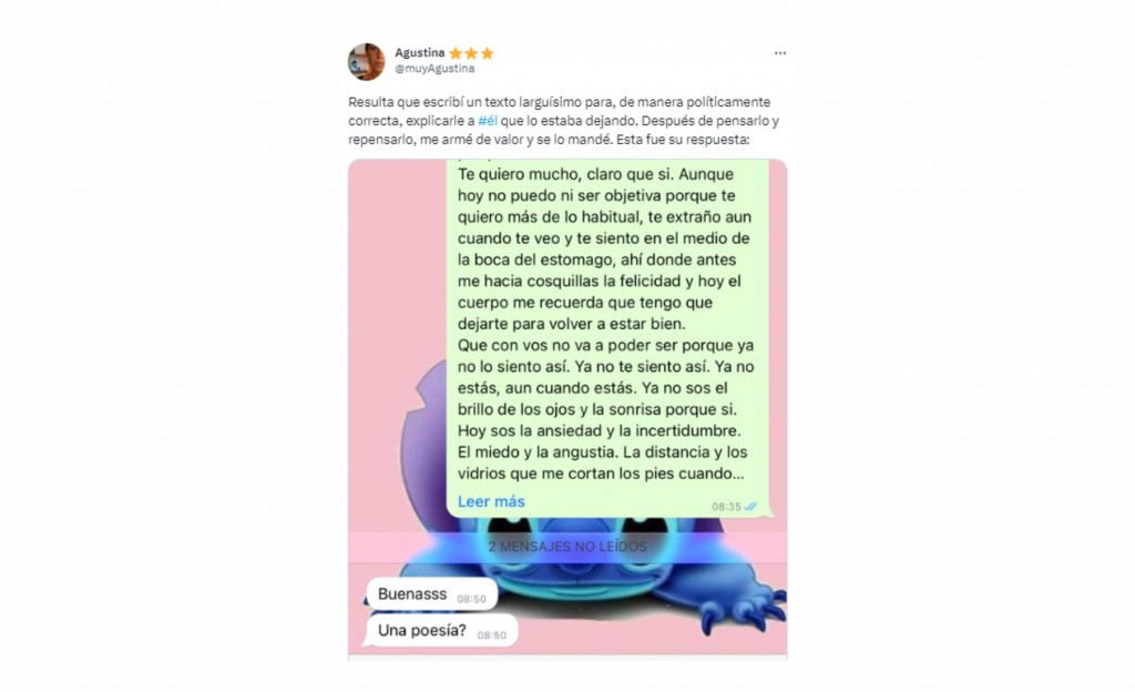 Resulta que escribà un texto larguÃsimo para, de manera polÃticamente correcta, explicarle a #él que lo estaba dejando. Después de pensarlo y repensarlo, me armé de valor y se lo mandé. Esta fue su respuesta: pic.twitter.com/SBBq994o0k