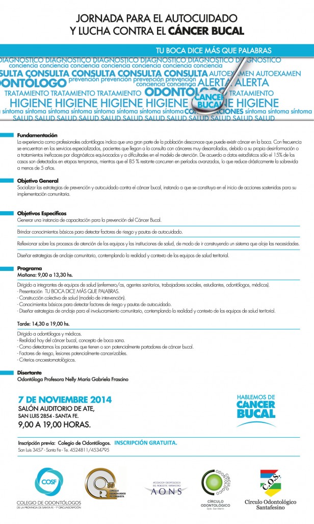 En el salón auditorio de ATE, odontólogos y médicos se capacitan en detección precoz de tumor oral. Unos 150 inscriptos participan de la charla teórica programa para la mañana y el trabajo en grupos, durante la tarde. Al respecto, los especialistas recomiendan mayor precaución en caso de existir factores de riesgo tales como tabaquismo, alcoholismo y demás adicciones. En tanto, buena higiene bucal, control de factores irritantes locales como las prótesis y consulta periódica al odontólogo constituyen las principales medidas para prevenir la enfermedad. Esta jornada para el autocuidado y la prevención del cáncer bucal es organizada por el Colegio de Odontólogos de Santa Fe 1ra. Circunscripción y el Círculo Odontológico Santafesino, entre otras entidades afines de la zona.