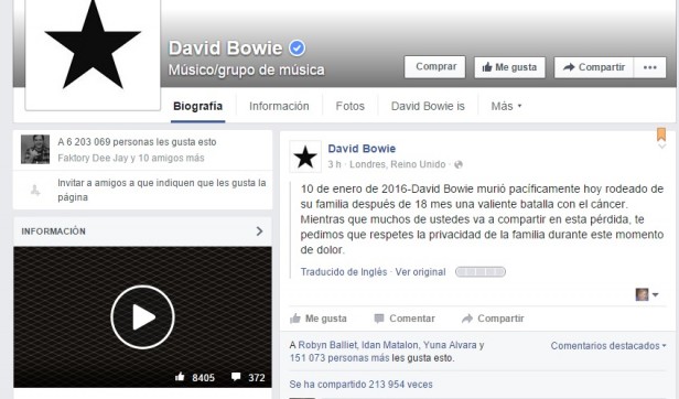A los 69 años, dejó de existir el músico y compositor británico que acababa de publicar su disco Blackstar el viernes 8, el mismo día de su cumpleaños. Después de una valiente lucha de 18 meses contra un cáncer, el Duque Blanco ha muerto en paz hoy, rodeado de su familia, según consigna en los perfiles oficiales del artista en Twitter y Facebook.