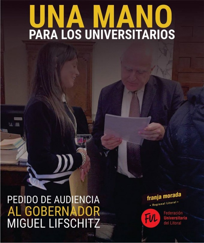 La presidenta de la Federación Universitaria del Litoral, Alicia Barletta, entregó a Miguel Lifschitz un comunicado donde se solicitaba una reunión con el primer mandatario provincial. Dentro del escrito, la FUL pedía una audiencia con el gobernador para hablar sobre los alquileres estudiantiles, becas, residencias, tarifas especiales y boleto gratuito.