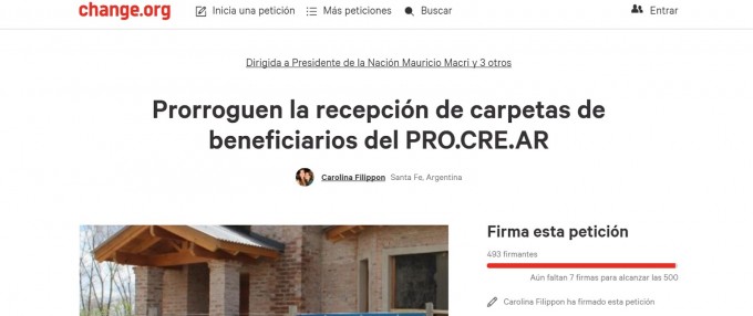 A través del espacio Change.org, una beneficiada por los créditos junta adhesiones, luego de que el banco le notificara la caducidad del programa para la edificación de una vivienda sin poseer terreno. La iniciativa de Carolina Filippon surge ante la falta de respuesta a la incertidumbre de los beneficiarios del ProCreAr, para reclamar las autoridades nacionales una prórroga y actualización de los créditos hipotecarios. Para sumar firmas al pedido, los interesados pueden ingresar al grupo en Facebook Procrear sorteados y dados de baja de Santa Fe.