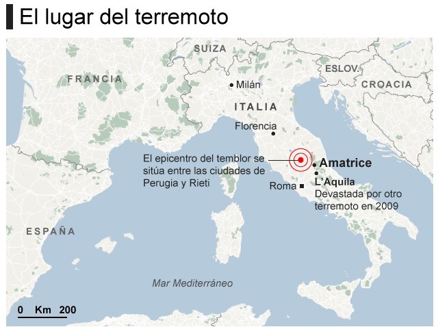 Un terremoto de 6,2° en la escala Richter sacució a Perugia y Riete, seguido de tres réplicas de en Perugia, Amatrice y Norcia. Todavía quedaban muchas personas bajo los escombros, por lo que la cifra de fallecidos podría aumentar, ya que había alrededor de 100 desaparecidos.