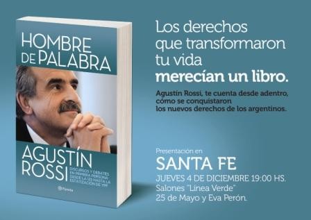 El Ministro de Defensa de la Nación lanza su obra denominada Hombre de Palabra, donde aborda la conquista de derechos de los argentinos, durante su período como jefe del Bloque de Diputados del Frente para la Victoria. La aprobación de la Resolución 125 y las leyes de movilidad jubilatoria, de medios y de matrimonio igualitario aparecen en el índice, así como la recuperación de YPF. Desde la hora 19, la presentación del libro de Agustín Rossi tiene lugar en los salones ubicados en 25 de Mayo y Eva Perón.