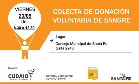 De 8.30 a 12, el Centro Único de Donación, Ablación e Implante de Órganos y Tejidos, invita a donar sangre en el hall del Concejo Municipal. Además del Cudaio, la secretaria de Salud de la ciudad de Santa Fe y Asoem participan de la campaña destinada a trabajadores municipales.