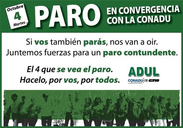 Durante la presente jornada, profesores del nivel superior nucleados en Conadu Histórica, de la que forma parte ADUL, concreta medidas de fuerza, en reclamo de un incremento salarial. En la protesta de hoy, también confluyen Conadu y UDA. Además, Conadu Histórica ya prevé otra huelga, para los días 13 y 14 de octubre.
