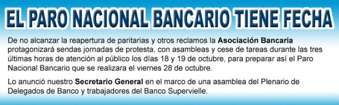 Los días martes y miércoles de la semana entrante, los empleados de entidades financieras no atenderán al público, durante las últimas tres horas de actividad. En caso de no recibir respuestas a su pedido de reapertura de paritarias, los bancarios concretarían un paro por 24 horas el viernes 28 de octubre.