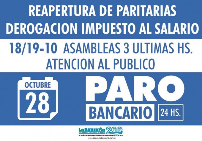 El 18 y 19 de octubre, los trabajadores de entidades bancarias realizaban asambleas en reclamo de la reapertura de la discusión de salarial. De esta manera, los bancos de la ciudad de Santa Fe no atendían al público desde las 10.15 hasta las 13.15. En tanto, la Bancaria confirmaba el paro nacional previsto para el próximo 28 de octubre.