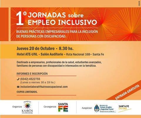 En la mañana del jueves, Kairos ocupacional lleva a cabo un encuentro para concientizar sobre la integración de personas con discapacidad a espacios de trabajo. Prevista en el Hotel UNL-ATE, la actividad relacionada a la inclusión laboral esta destinada a profesionales y estudiantes de la salud, empresarios, familiares de discapacitados y público en general.