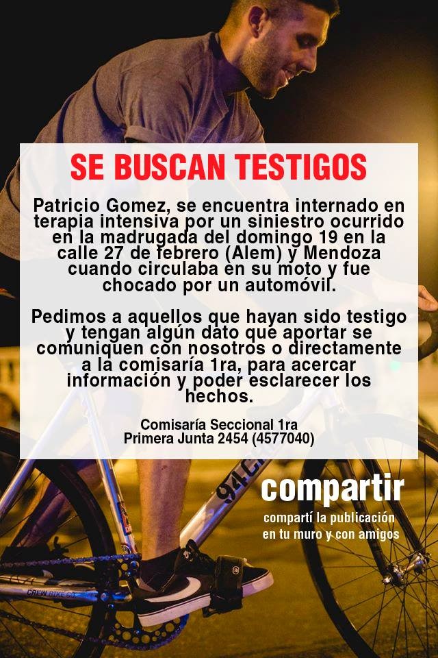 La agrupación local de ciclista convoca a testigos para esclarecer el siniestro vial ocurrido el pasado domingo a la madrugada en Avenida 27 de Febrero y Mendoza. Precisamente, la víctima del accidente, Patricio Gomez, se encuentra en terapia intensiva tras ser chocado por un auto mientras conducía su moto. Quienes tengan datos sobre lo ocurrido deben dirigirse a la Comisaria Primera o llamar al 4577040.