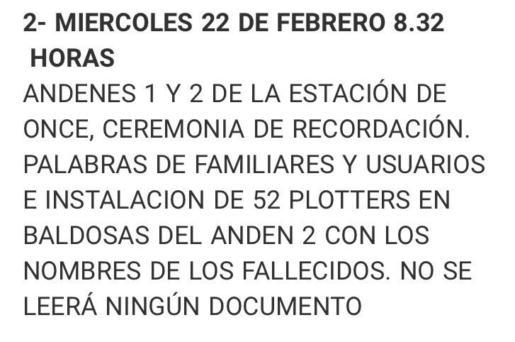 Durante todo el día, familiares, amigos y sobrevivientes del mayor accidente ferroviario de la historia recuerdan a las 52 víctimas. Para exigir sentencia firme y prisión efectiva para los condenados, las conmemoraciones inician a las 8.32, hora en la que, el 22 de febrero de 2012, la formación del ferrocarril Sarmiento no frenó al llegar a la plataforma 2 en la estación de Once.