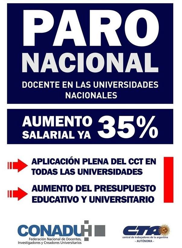 Esta semana, la Federación Nacional de Docentes, Investigadores y Creadores Universitarios realiza un paro de tres días, en reclamo del 35 por ciento de aumento salarial. Además, el 4 de abril CONADU histórica hace una conmemoración por los 10 años del asesinato del docente neuquino Carlos Fuentealba.