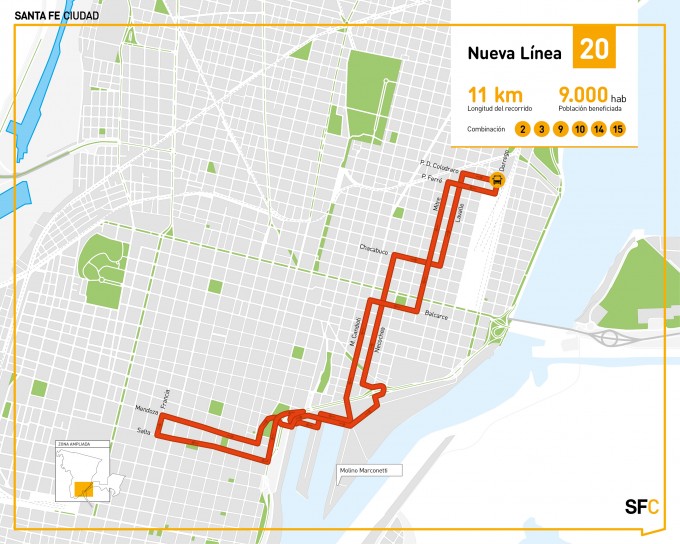 Las unidades de colectivo inauguradas hace algunas semanas, tenían como nueva parada la intersección de Dorrego y Pedro Díaz Colodrero. De esta manera, la flamante línea 20 extendía su circulación por Candioti Norte, transitando desde su nuevo punto de partida hasta Pedro Ferré, tomando por ésta arteria hasta Mitre, para después llegar a Balcarce, y desde allí retomar su recorrido habitual.
