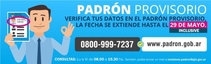 Hasta el 29 de mayo, los ciudadanos habilitados para votar pueden chequear su situación domiciliaria los padrones provisorios. Además, la Cámara Electoral recuerda que los documentos válidos para votar son la Libreta de Enrolamiento, Libreta Cívica, DNI, tarjeta de DNI Libreta Celeste y nuevo DNI tarjeta, siempre y cuando se encuentre en buen estado y sea el último tramitado por el ciudadano, aún cuando lleve impresa la leyenda 'No válido para votar'".