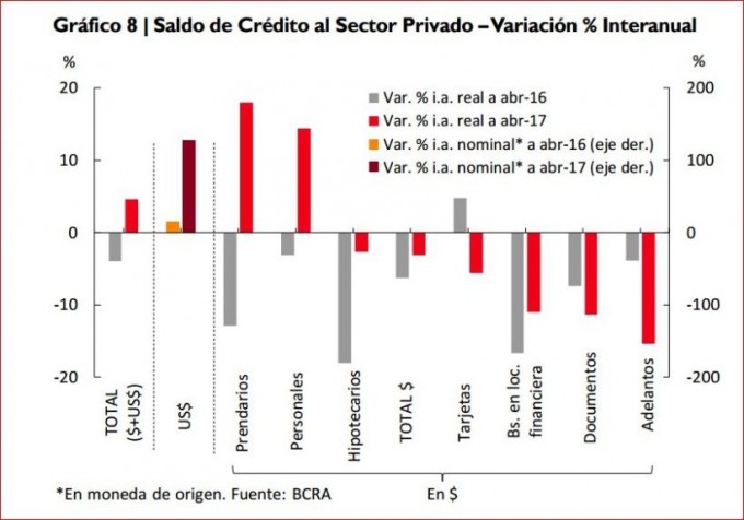 En abril, crecieron los préstamos y depósitos en moneda extranjera, con menores índices de liquidez y rentabilidad más baja para los bancos. Según el Central, desde el comienzo de 2017 el financiamiento bancario a empresas y familias registraba variaciones interanuales reales positivas, comportamiento que se observaba en la mayoría de los grupos de entidades financieras.