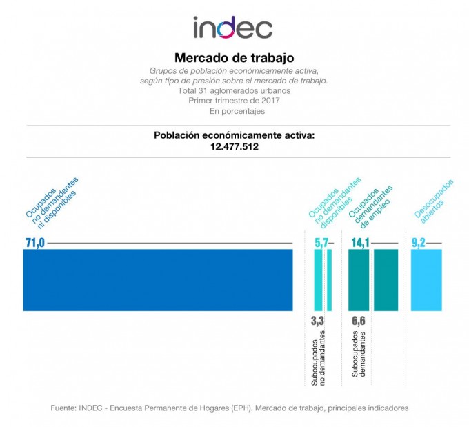 Según el INDEC, el desempleo bajó una décima, entre enero y marzo, respecto de igual período del año pasado. En cuanto a la tasa de actividad, entendida como la cantidad de personas que salió a buscar trabajo sobre el total de la Población Económicamente Activa, se mantuvo en torno al 45,5 % en el primer trimestre de 2017.