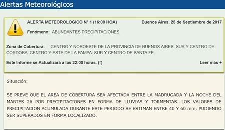 Parte de la provincia aguarda lluvias y tormentas intensas durante la madrugada y la mañana del martes. Durante ese período, el Servicio Meteorológico Nacional estima valores de precipitación acumulada de 40 a 60 milímetros, pudiendo ser superados en forma localizada. Las condiciones afectan a centro y noroeste de Buenos Aires, sur y centro de Córdoba, centro y este de La Pampa, y centro y sur de Santa Fe.