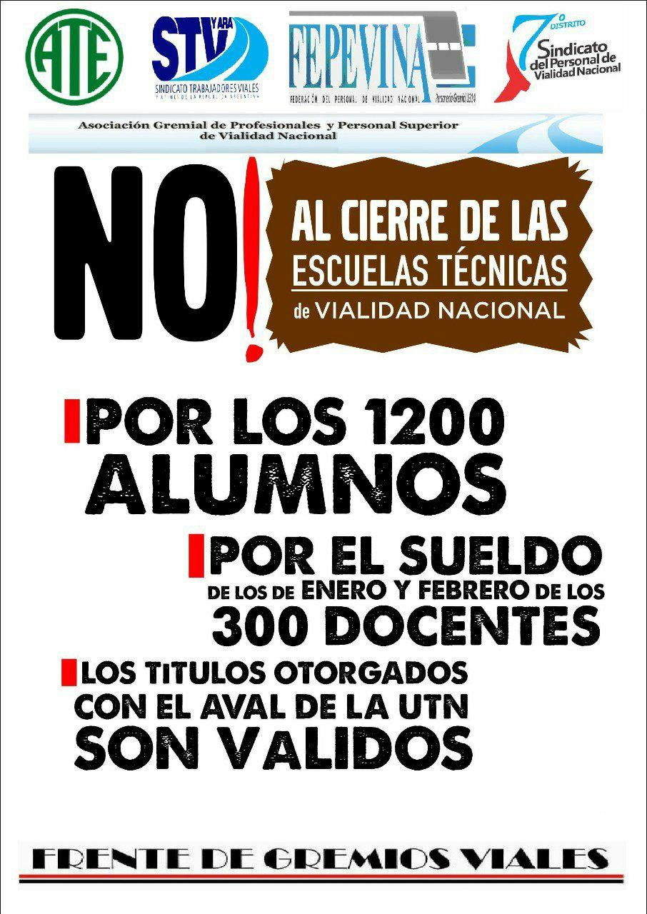 A media mañana, la comunidad educativa de la escuela Técnica de Vialidad Nacional Nº 4, Ingeniero Luis María Barletta, se concentran en 27 de Febrero y Juan de Garay, bajo el lema NO al cierre de escuelas viales. El sindicato del personal de Vialidad del séptimo distrito acompaña la protesta, para apoyar a docentes y alumnos que iniciaron el ciclo lectivo el 12 de marzo, pese a que los profesores no han cobrado salarios desde enero.