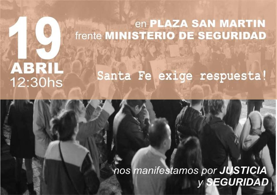 El próximo jueves 19 de abril, la asociación de familiares de víctimas de la inseguridad realizan una concentración bajo la consigna "Santa Fe exige respuesta". Desde las 12.30, la convocatoria por más seguridad se concreta frente al ministerio de Seguridad, en Primera Junta y 9 de Julio.