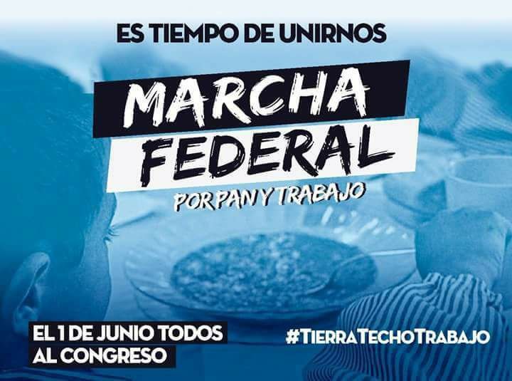 El próximo 31 de mayo a las 10, la multisectorial por el pan y el trabajo realizará un acto en la Plaza 25 de mayo. La Marcha Federal tendrá como objetivo final llegar al Congreso Nacional, el 1° de junio, para impulsar las leyes de "Agricultura Familiar", "Integración Urbana", "Emergencia Alimentaria", entre otras.