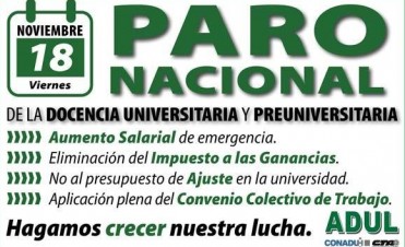 Esta tarde,las federaciones que representan a profesores del nivel superior, Conadu y Conadu histórica, se reúnen con representantes del Ministerio de Educación. El reclamo de aumento salarial supera el 35 %, sumado al pedido de publicación del Convenio Colectivo de Trabajo para educadores universitarios, entre otros ítems. Mientras tanto, en la UNL, Adul sigue con sus medidas de fuerza hasta el viernes.