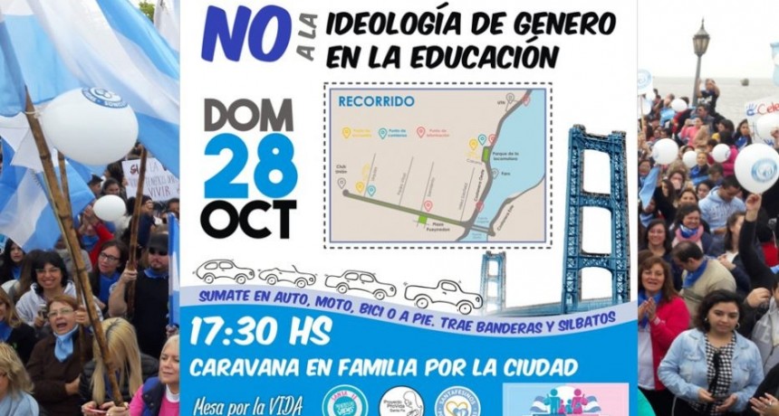 Para el domingo, diversas agrupaciones invitan a participar de una marcha en auto, moto, bicicleta o a pie, en un marco de enfrentamiento político y religioso por las leyes de Educación y de Educación Sexual Integral en la provincia, ambas con media sanción de la Cámara de Diputados. A las 17:30, las columnas partirán desde Parque de la Locomotora, Costanera y Calcena, y la esquina de Urquiza y Boulevard Pellegrini, para recorrer toda la Costanera Oeste y Bulevar, hasta finalizar en el Parque ubicado en avenida Almirante Brown y Pasaje Calcena.