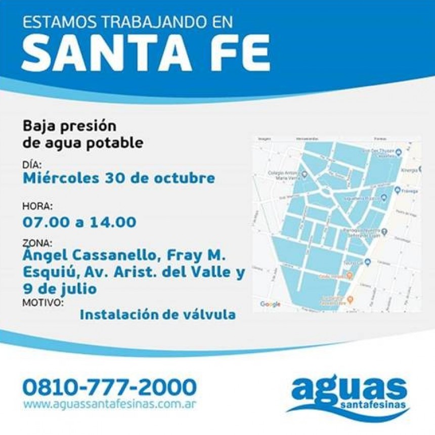 Del 31 de julio al 2 de agosto, de 8 a 14 horas, Aguas Santafesinas disminuye la presión del suministro en la zona comprendida por Pedro de Vega, Derqui, Aristóbulo del Valle y 4 de Enero. Durante la suspensión del servicio, la empresa proveedora de agua potable realiza tareas de limpieza de la red, sobre Aristóbulo del Valle entre Huergo y Pedro de Vega.
