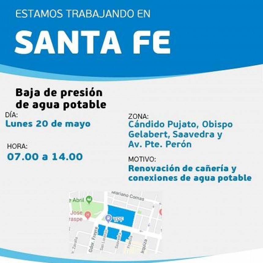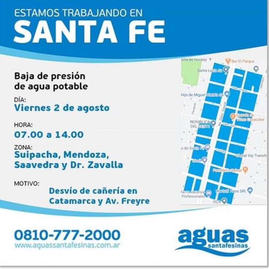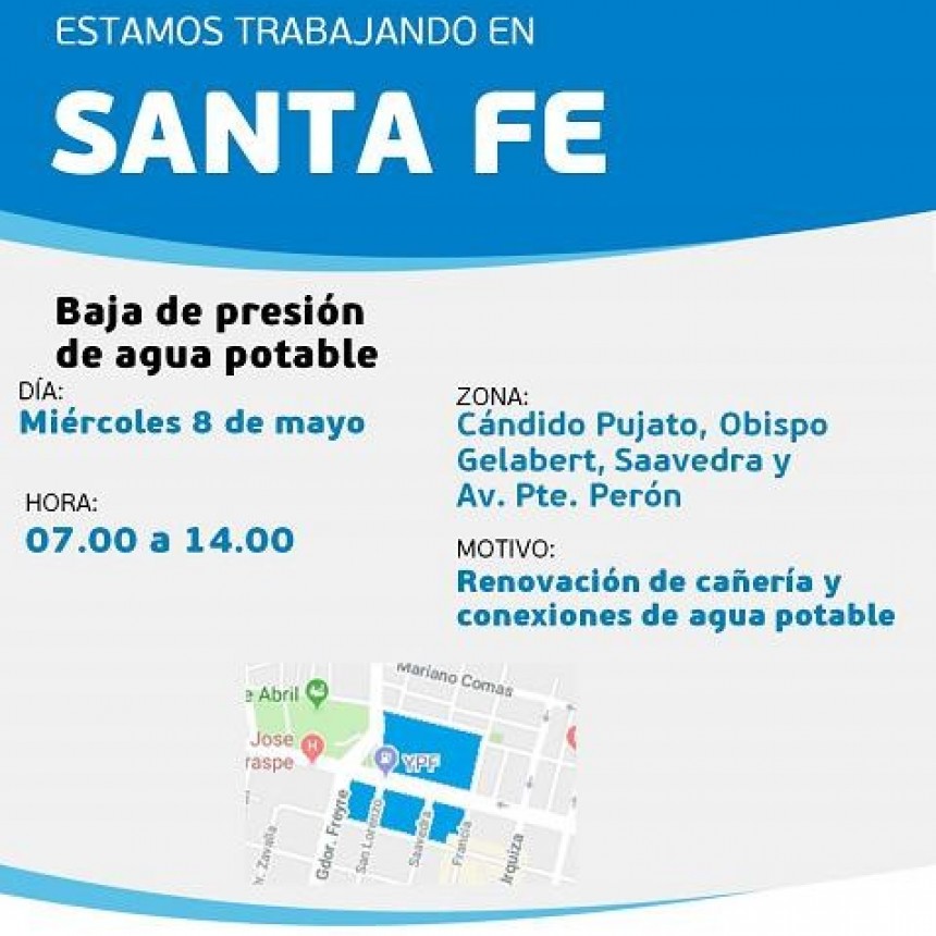 De 7 a 14 horas, ASSA disminuye el suministro, en la zona comprendida por Cándido Pujato, Obispo Gelabert, Saavedra y Avenida Presidente Perón. Precisamente, la baja presión de agua se debe a la renovación de la red de distribución y cañerías domiciliarias, en la zona.