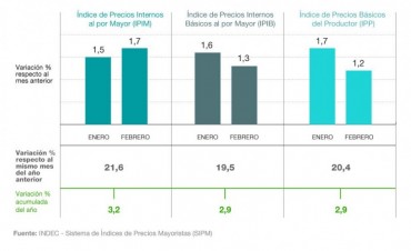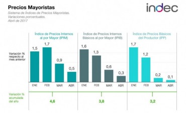 Según el INDEC, el mes pasado se registraron subas de 1,5 % en los productos primarios y en los manufacturados; y del 5,5 % en energía eléctrica, además de 2 % en los importados. Entre los productos primarios, se destacó la suba del 3,2 % en petróleo crudo y gas. Y entre los manufacturados se registraron alzas de 4,8 % en refinados de petróleo; 2,1 % en químicos; entre otros.