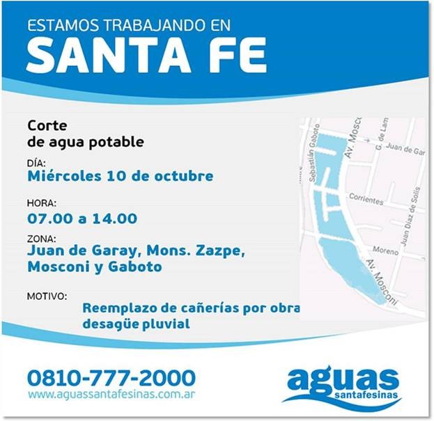 Mañana, de 7 a 14 horas, ASSA disminuye la presión del suministro, en la zona comprendida por Juan de Garay, Monseñor Zazpe, Mosconi y Gaboto. Durante la suspensión del servicio, la empresa proveedora de agua potable reemplaza cañería distribuidora y conexiones domiciliarias sobre calle Moreno, entre Mosconi y Gaboto.