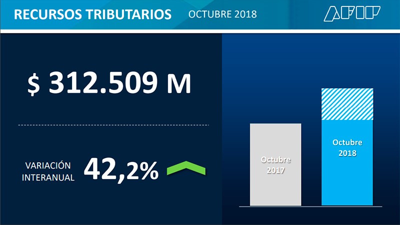 Impulsados por el IVA, débitos y créditos e impuestos al comercio exterior, los ingresos impositivos superaron los 312 mil millones de pesos, el mes pasado. Según AFIP, la recaudación fiscal aumentó 30,4 % en los primeros 10 meses del año, frente al mismo período de 2017.