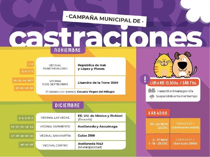 Entre lunes y viernes, la unidad veterinaria móvil esteriliza quirúrgicamente a perros y gatos, en Avellaneda y Azcuánega. La atención tiene lugar, a partir de la hora 13:30. Y el sábado 15, ocurre lo propio en el obrador municipal ubicado en San Luis 2950, desde la hora 7.