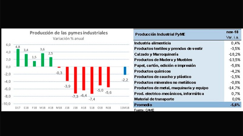 Según CAME, la actividad fabril de pequeñas y medianas empresas cayó 5,6 % interanual. En noviembre, las bajas más acentuadas se dieron en calzado y marroquinería; así como en productos de metal, maquinaria y equipo; entre otros.