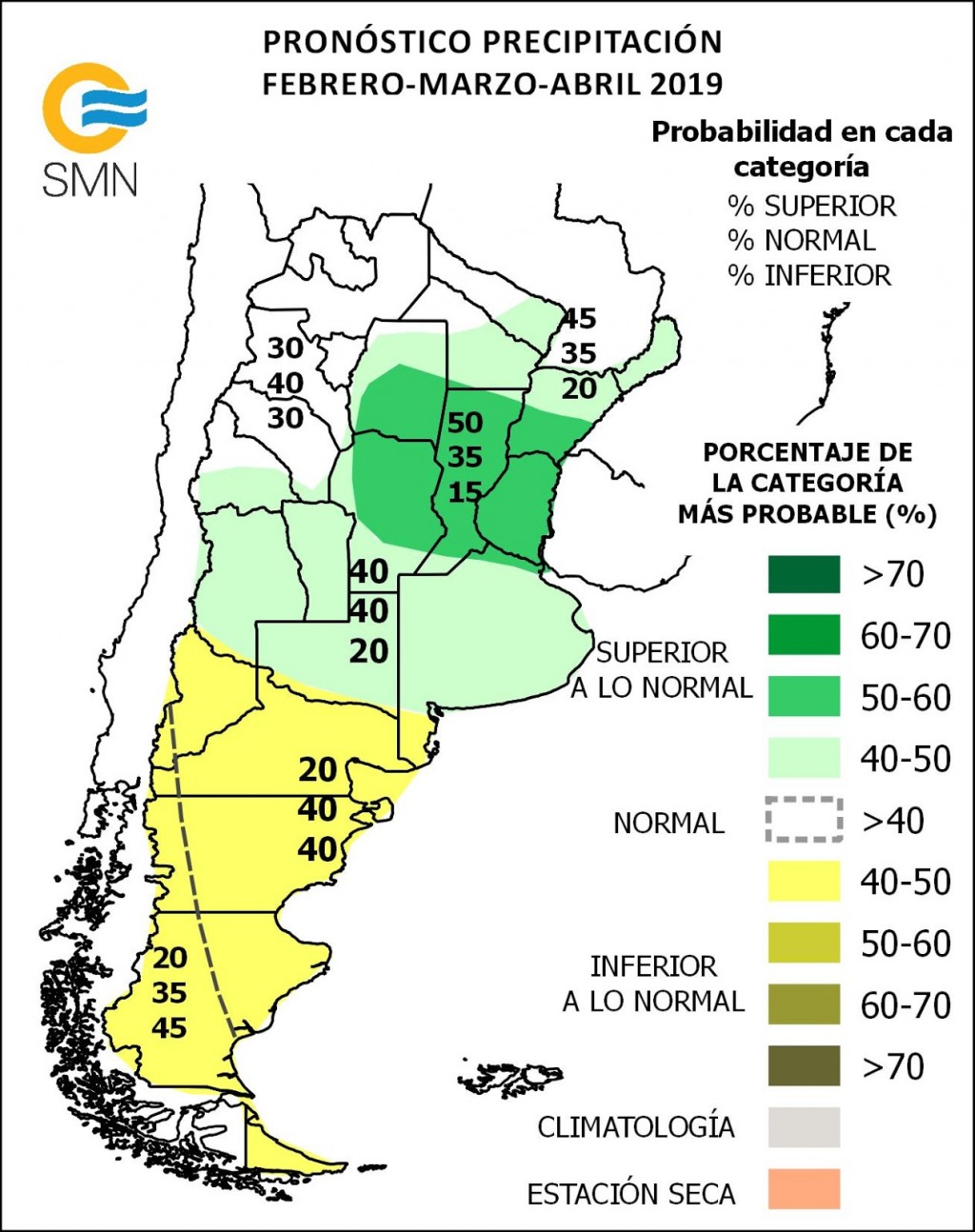 En el último pronóstico trimestral, el Servicio Meteorológico anticipa ocurrencia de precipitación mayor a la habitual sobre el Litoral, Santa Fe, Chaco, Santiago del Estero y Córdoba. En cuanto a las temperaturas, los registros serían normales o inferiores a lo normal sobre centro y sur del Litoral, Santa Fe y centro-este de Córdoba, entre febrero y abril.