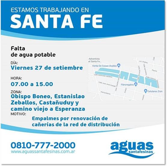 De 7 a 15, ASSA interrumpe el suministro en el sector comprendido Obispo Boneo, Estanislao Zeballos, Castañuduy y camino viejo a Esperanza. Durante la suspensión del servicio, la empresa proveedora de agua potable realiza la ejecución de empalmes por renovación de cañerías de la red de distribución