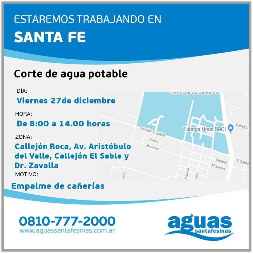 De 8 a 14, Aguas Santafesinas interrumpe el suministro en el sector delimitado por Callejón Roca, Aristóbulo Del Valle, Callejón El Sable y Zavalla. Durante el corte del servicio, ASSA realiza tareas de empalme de cañerías en Facundo Zuviría en la intersección con calles Aguayo y Espinosa.