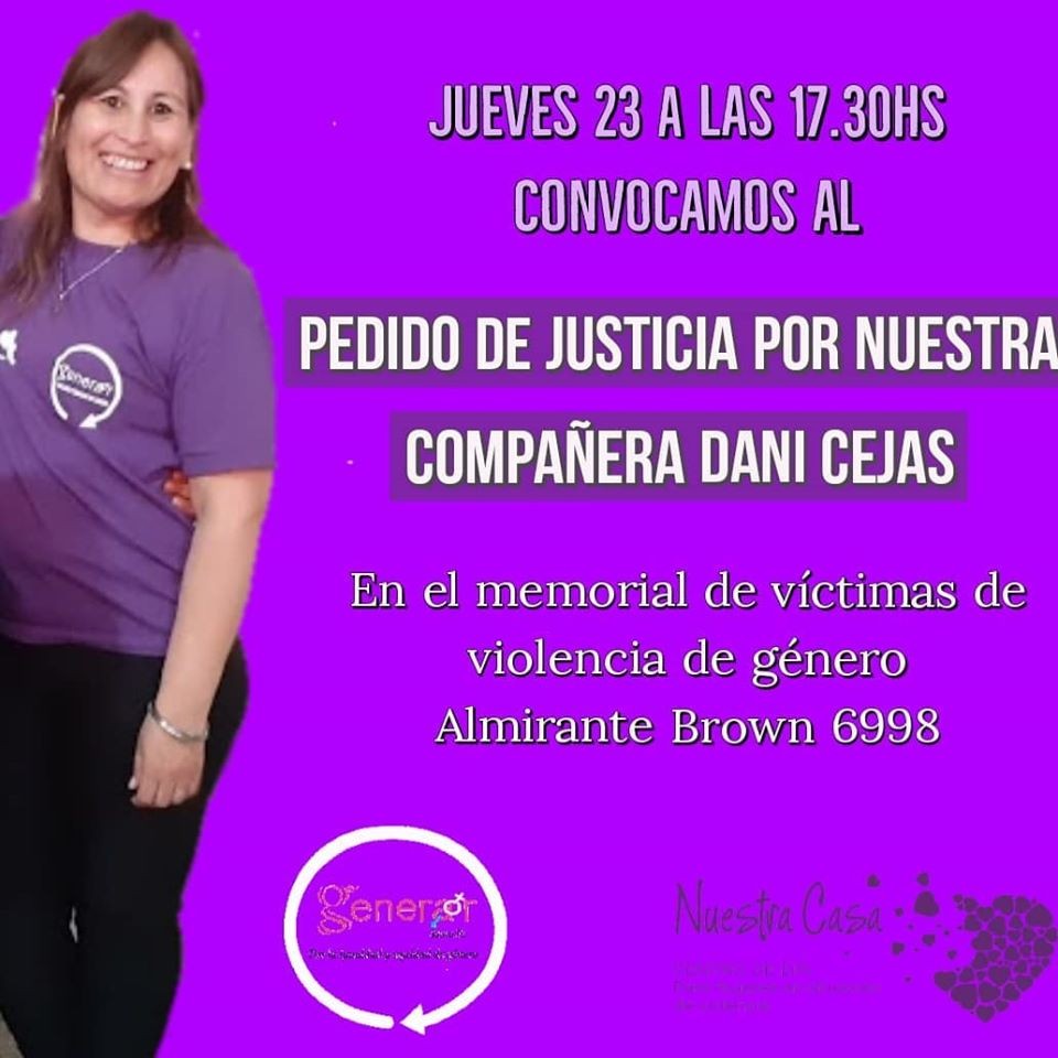 Este jueves a las 17.30, la Asociación Civil encabeza una movilización para pedir justicia por su vicepresidenta, quien apareció fallecida en el centro de día de la organización donde se asiste a víctimas de violencia de genero. La concentración por el esclarecimiento de la muerte de Daniela Cejas se lleva a cabo en el Memorial ubicado en Almirante Brown al 6900. En tanto, la fiscalía trabaja en el caso con el protocolo de investigación de femicidios.