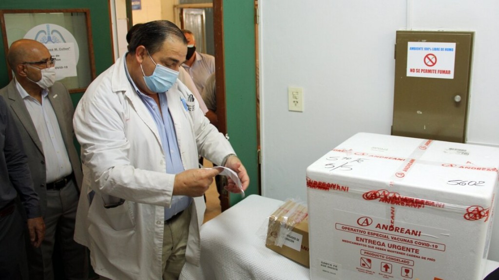 El secretario de Salud, Jorge Prietto y el director del hospital Cullen, Juan Pablo Poletti, anuncian la llegada de la vacuna Sputnik V al hospital Cullen.
