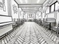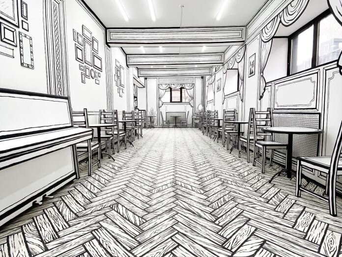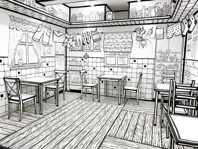 Cada rincón del local parece sacado de las páginas de un cómic. En las paredes hay toda clase de elementos, todos decorados en blanco y negro. Los radiadores, las cortinas, los floreros e incluso las plantas están pintadas sobre las paredes.